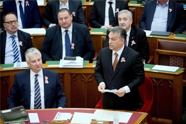 Orbán Viktor miniszterelnök válaszol a Jobbik frakcióvezető-helyettese, Vona Gábor azonnali kérdésére az Országgyűlés plenáris ülésén 2017. március 13-án. Mellette balról Semjén Zsolt nemzetpolitikáért felelős miniszterelnök-helyettes. (MTI Fotó: Koszticsák Szilárd)