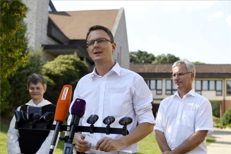 Rétvári Bence, az Emberi Erőforrások Minisztériumának (Emmi) parlamenti államtitkára sajtótájékoztatón beszél, mellette Soltész Miklós, az Emberi Erőforrások Minisztériumának (Emmi) egyházi, nemzetiségi és civil társadalmi kapcsolatokért felelős államtitkára (j) és Binder Zita ciszterci nővér a ciszterci nővérek kismarosi monostorában 2017. augusztus 1-jén. A sajtótájékoztatón bejelentették, hogy az állam támogatja a helyi gyümölcsmanufaktúra és lelkigyakorlatos ház fejlesztését. (MTI Fotó: Koszticsák Szilárd)