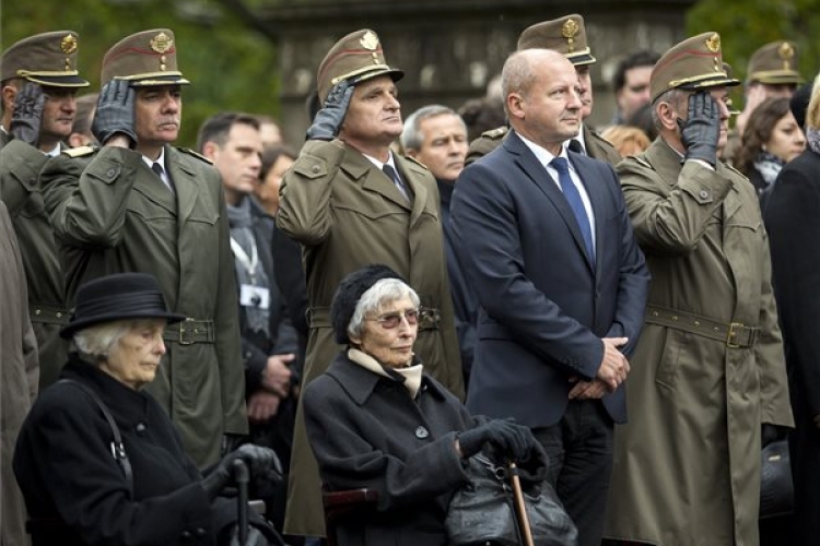 Simicskó István kereszténydemokrata honvédelmi miniszter, mellette Benkő Tibor vezérezredes, vezérkari főnök (j), Antall Józsefné, Antall József néhai miniszterelnök özvegye (b) és Mádl Dalma, Mádl Ferenc néhai köztársasági elnök özvegye (b2) Batthyány Lajos és családja nyughelyénél a Fiumei úti Nemzeti Sírkertben, a Batthyány-mauzóleumnál tartott megemlékezésen az aradi vértanúk emléknapján, 2016. október 6-án. (MTI Fotó: Mohai Balázs)