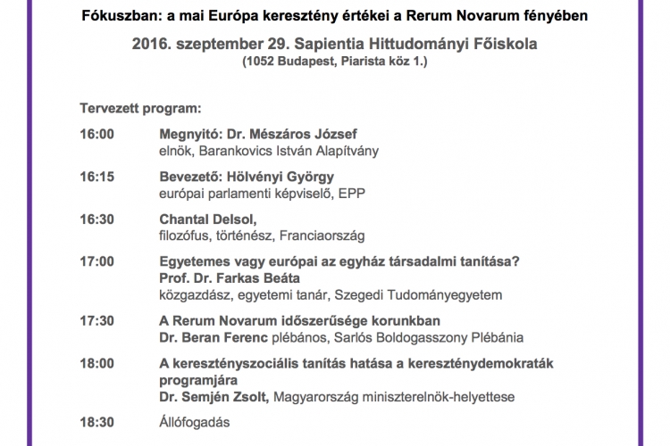 A Rerum Novarum, XIII. Leó pápa enciklikája az idén 125 éves. Ebből az alkalomból szeptember 29-én a Barankovics István Alapítvány konferenciát szervez Budapesten, Fókuszban: a mai Európa keresztény értékei a Rerum Novarum fényében címmel. A konferencián több jeles előadó között Semjén Zsolt miniszterelnök-helyettes, a KDNP elnöke és Hölvényi György kereszténydemokrata európai parlamenti képviselő is felszólal.