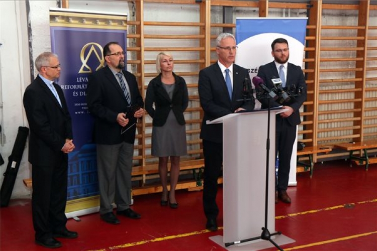 Soltész Miklós, az Emberi Erőforrások Minisztériuma egyházi, nemzetiségi és civil társadalmi kapcsolatokért felelős államtitkára, a KDNP alelnöke (j2) sajtótájékoztatón beszél a miskolci Lévay József Református Gimnázium és Diákotthonban tartott sajtótájékoztatón 2017. április 10-én. Mögötte Holzinger Ferenc SJ, a Fényi Gyula Jezsuita Gimnázium és Kollégium igazgatója, Ábrám Tibor, a Lévay József Református Gimnázium és Diákotthon igazgatója, Csöbör Katalin, a térség fideszes országgyűlési képviselője és Schanda Tamás európai uniós fejlesztéspolitikáért felelős államtitkár (b-j). (MTI Fotó: Vajda János)