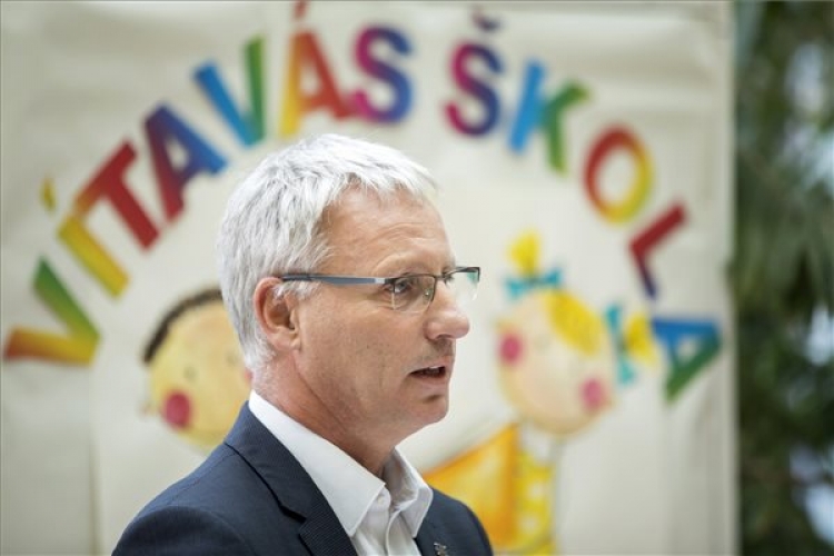 Soltész Miklós, az Emberi Erőforrások Minisztériumának (Emmi) egyházi, nemzetiségi és civil társadalmi kapcsolatokért felelős államtitkára beszél a XIII. kerületi Szlovák Tanítási Nyelvű Óvoda, Általános Iskola, Gimnázium és Kollégiumban tartott sajtótájékoztatón 2017. szeptember 25-én. (MTI Fotó: Mohai Balázs)