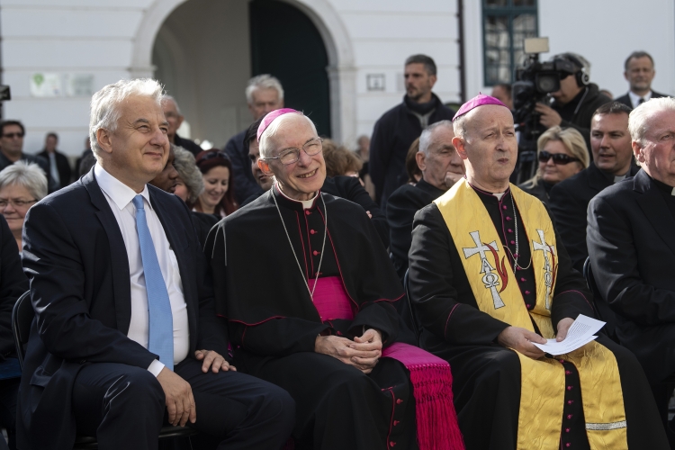 Semjén Zsolt miniszterelnök-helyettes, a KDNP elnöke (balra), Michael August Blume érsek, Magyarország új apostoli nunciusa (középen) és Márfi Gyula veszprémi érsek (jobbra) a veszprémi érseki palota teljes külső és részleges belső felújítását követő átadási ünnepségen 2018. október 4-én. (MTI Fotó: Szigetváry Zsolt)