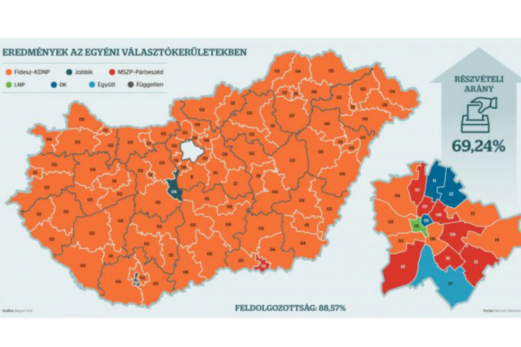 Kétharmados eredményt ért el a Fidesz–KDNP a 2018-as országgyűlési választáson. Vasárnap éjjel a voksok 88 százalékos feldolgozottsága mellett a fővároson kívül alig akad olyan választókerület, ahol az ellenzék nyerni tudott. Az MSZP és a Párbeszéd szövetsége pedig éppen csak megugrotta a 10 százalékos küszöböt. A Jobbik elnöke, Vona Gábor bejelentette, hogy lemond posztjáról.