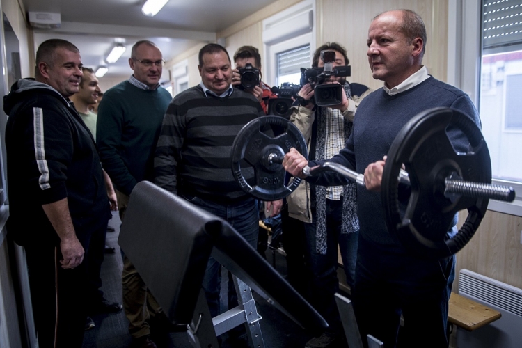 Simicskó István honvédelmi miniszter súlyt emel (j) Hercegszántón, a határvédelmi bázison 2017. december 14-én. Mellette Zsigó Róbert, a Földművelésügyi Minisztérium élelmiszerlánc-felügyeletért felelős államtitkára (b3) és Németh Szilárd, az Országgyűlés honvédelmi és rendészeti bizottságának fideszes elnöke (b4). MTI Fotó: Ujvári Sándor