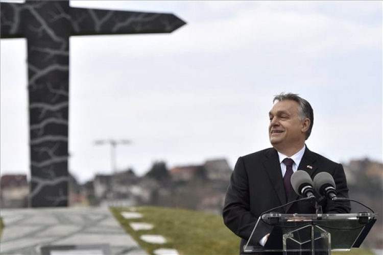 Orbán Viktor miniszterelnök beszédet mond a szmolenszki légikatasztrófa áldozatainak emlékére állított, Mementó Szmolenszkért elnevezésű emlékmű felavatásán Budafokon 2018. április 6-án. (MTI Fotó: Máthé Zoltán)