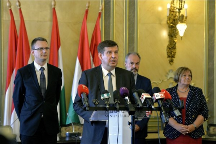 Elöl Sipos Imre helyettes államtitkár beszél, mögötte Rétvári Bence, az Emberi Erőforrások Minisztériumának (Emmi) parlamenti államtitkára, Zalay Szabolcs, a gyermek és tanulói munkacsoport vezetője és Csépe Valéria, az MTA Közoktatási Elnöki Bizottsága (KEB) elnöke (b-j) a köznevelési kerekasztal 9. alkalommal tartott ülését követő sajtótájékoztatón az Emmi Tükörtermében, Budapesten 2016. június 14-én. (MTI Fotó: Máthé Zoltán)