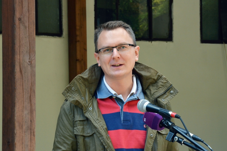 Rétvári Bence parlamenti államtitkár, a KDNP alelnöke beszél a több mint 100 éves nagybörzsönyi kisvasút újraindításának 15. évfordulóján. (Fotó: Váli Miklós)