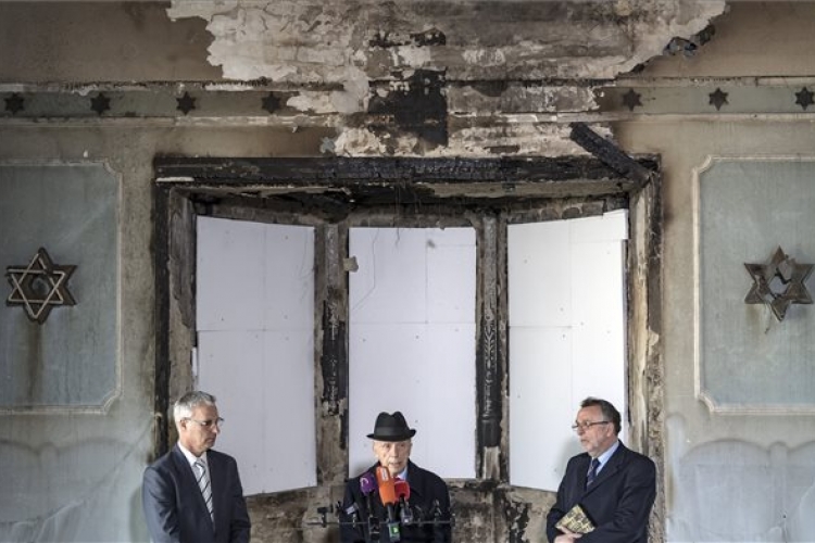 Soltész Miklós, az Emberi Erőforrások Minisztériumának (Emmi) nemzetiségi és civil társadalmi kapcsolatokért felelős államtitkára, a KDNP alelnökeKardos Péter főrabbi és Heisler András, a Magyarországi Zsidó Hitközségek Szövetségének (Mazsihisz) elnöke (b-j) a kormány felújítási támogatását bejelentő sajtótájékoztatón a 2016 októberében leégett zuglói zsinagógában 2017. március 28-án. (MTI Fotó: Szigetváry Zsolt)