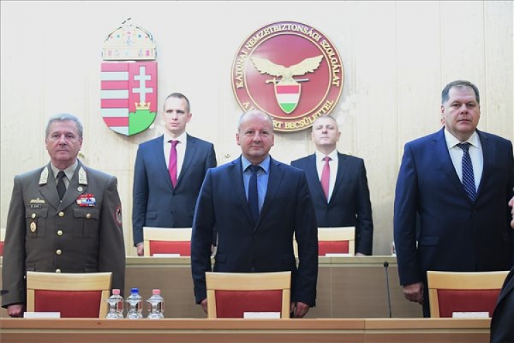 Simicskó István honvédelmi miniszter (k), Benkő Tibor, a Honvéd Vezérkar főnöke (b) és Kovács József, a Katonai Nemzetbiztonsági Szolgálat főigazgatója (j) a véderő-, katonai és légügyi attasék éves értekezletén a szolgálat fővárosi székházában 2017. június 27-én. (MTI Fotó: Kovács Tamás)