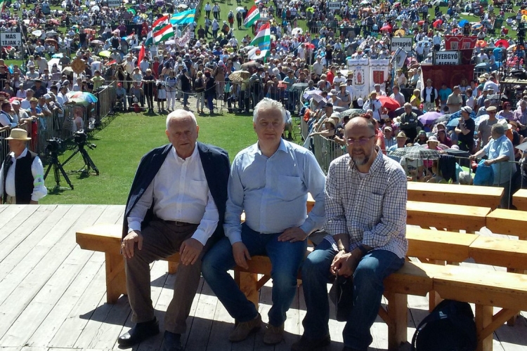 Harrach Péter, a Kereszténydemokrata Néppárt parlamenti frakcióvezetője, Semjén Zsolt, a KDNP elnöke és Kelemen Hunor, az Romániai Magyar Demokrata Szövetség elnöke Csíksomlyón, a szombati szentmisére várva. Mögöttük több százezres zarándoktömeg gyülekezik
