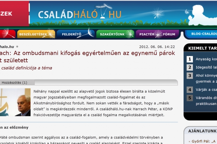 Szabó Máté ombudsman szerint aggályos az a család-fogalom, amely a családvédelmi törvényben a társkapcsolatok köréből kizárólag a házasságot nevesíti a család alapjaként. A Családháló.hu megkérdezte az ügyben Harrach Pétert, a családvédelmi sarkalatos törvényt kidolgozó kereszténydemokrata frakció vezetőjét, aki elmondta, hogy véleményük szerint a család egy férfi és egy nő tartós és kizárólagos kapcsolatára épül.