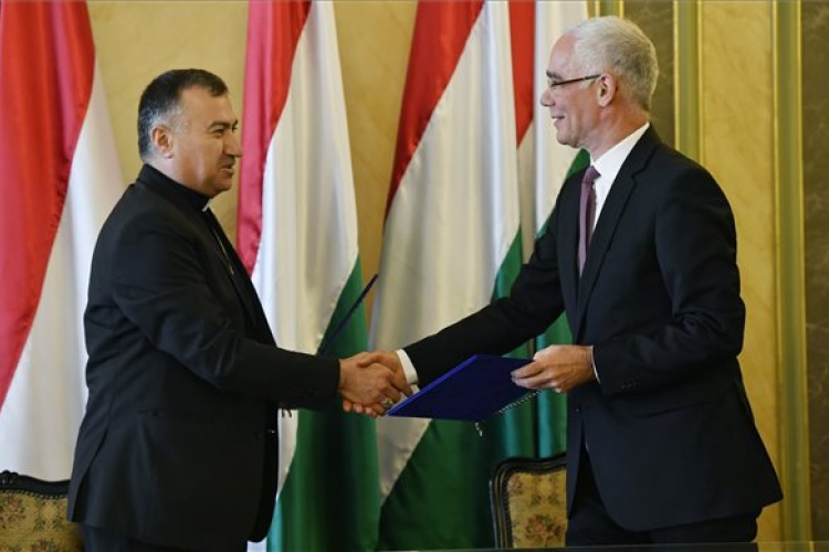 Balog Zoltán, az emberi erőforrások minisztere (j) és Basár Matte Varda erbíli érsek kezet fog az iraki Erbíl Szent József Kórházának nyújtott magyar gyógyszertámogatásról szóló okirat aláírása után az Emberi Erőforrások Minisztériuma (Emmi) Tükörteremében 2017. május 29-én. A magyar kormány finanszírozza az otthonukból elüldözött keresztényeket ellátó erbíli Szent József-kórház féléves gyógyszerszükségletét. MTI Fotó: Illyés Tibor