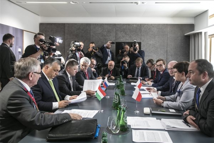 Orbán Viktor magyar (b2), Robert Fico szlovák (b3), Bohuslav Sobotka cseh (j3) és Beata Szydlo lengyel (j2) miniszterelnök a V4-ek megbeszélésén az Európai Unió állam- és kormányfőinek kétnapos csúcstalálkozója előtt Brüsszelben 2017. június 22-én. (MTI Fotó: Miniszterelnöki Sajtóiroda / Szecsődi Balázs)