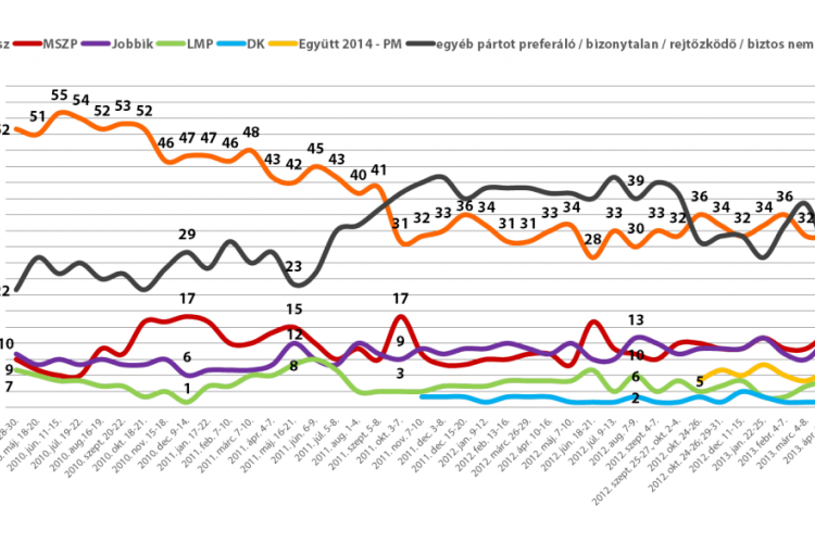 A felmérés szerint - pártszimpátia alapján – az összes megkérdezett 32 százaléka támogatja a kormánypártokat, 22 százaléka pedig az együttműködésre kész baloldalt (az MSZP-t 14, a Demokratikus Koalíciót 1, az Együtt 2014 – PM választási szövetséget pedig 7 százalék).
