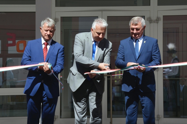 Törő Gábor országgyűlési képviselő (Fidesz), Semjén Zsolt miniszterelnök-helyettes és Fenyves Péter móri polgármester (Fidesz-KDNP) a nemzeti színű szalag átvágásával felavatta az új iskolaépületet (KDNP Fotó: Váli Miklós)