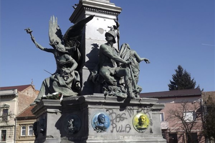 Bognár Levente, Arad alpolgármestere hétfőn az MTI-nek azt mondta: a térfigyelő kamerák felvétele szerint szombat délelőtt 11 óra 15 perckor érkezett három álarcos ember a szoborhoz, és mindössze 45 másodperc alatt piros, sárga és kék színű festékszóróval befújta a vértanú tábornokok bronzplakettjeit, valamint magyargyalázó szöveget írt a talapzatra.