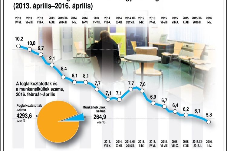 Az euróövezet statisztikai hivatala az Eurostat keddi közlése szerint Magyarország az Európai Unió 28 tagállama között az ötödik legalacsonyabb munkanélküliségi rátával rendelkezett áprilisban, 5,6 százalékos mutatóval. Az adatokat kommentálva Pesuth Tamás, a Budapesti Corvinus Egyetem oktatója az M1 aktuális csatornán elmondta, hogy több mint 10 éve nem volt ilyen alacsony a munkanélküliségi ráta Magyarországon.