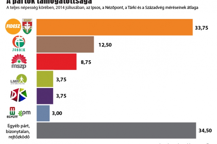 A Századvég 1000 fő telefonos megkeresésével készült kutatása alapján a Fidesz–KDNP-re a teljes népesség 35 százaléka szavazna „most vasárnap”. A kormánypártok az országgyűlési választások óta lényegében nem veszítettek szavazókat. A Századvég mérései során másodszor fordult elő, hogy a Jobbik megelőzte az MSZP-t, így 2014 júliusában 14 százalékkal a második legnépszerűbb párt. A teljes népesség körében a szocialisták 9, az LMP 4 százalékon áll. Az Együtt–PM támogatottsága 3, a Demokratikus Koalícióé pedig 6 százalék. Más pártokra a teljes népesség 2 százaléka szavazna.