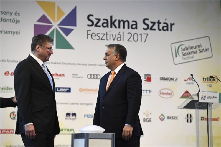Orbán Viktor miniszterelnök (j) és Parragh László, a Magyar Kereskedelmi és Iparkamara (MKIK) elnöke a X. Szakma Sztár Fesztivál, a Szakma Kiváló Tanulója Verseny (SZKTV), valamint az Országos Szakmai Tanulmányi Verseny (OSZTV) országos döntőjének megnyitóján a Hungexpo Budapesti Vásárközpont G pavilonjában 2017. április 24-én. (MTI Fotó: Koszticsák Szilárd)