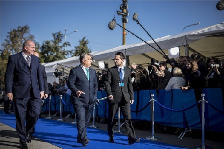 Tallinn, 2017. szeptember 29. A Miniszterelnöki Sajtóiroda által közreadott képen Orbán Viktor miniszterelnök (k) érkezik Havasi Bertalan, a Miniszterelnöki Sajtóiroda vezetője (j) társaságában az európai uniós tagországok állam-, illetve kormányfői csúcstalálkozójára Tallinnban 2017. szeptember 29-én. Az EU-csúcs témája a digitális innováció. MTI Fotó: Miniszterelnöki Sajtóiroda / Szecsődi Balázs