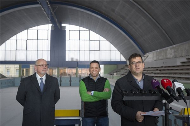 Seszták Miklós nemzeti fejlesztési miniszter (j) a felújítás alatt álló fővárosi Komjádi Uszodában tartott sajtótájékoztatón 2017. január 6-án. Június közepére készül el a szinte teljesen átépített Komjádi Uszoda, amely a nyári vizes világbajnokság edzőközpontja lesz. Balról Bienerth Gusztáv, a 2024-es magyarországi olimpiai pályázat alelnöke (b) és Fürjes Balázs, a budapesti olimpiai pályázat vezetője. (MTI Fotó: Mohai Balázs, Videó: kormany.hu)