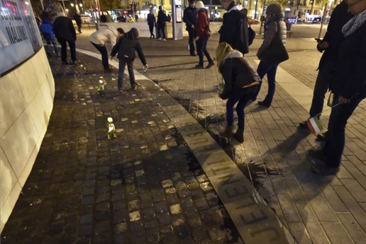 Résztvevők vízzel locsolják le a Móricz Zsigmond téri Gomba körüli új '56-os emlékművet az alkotás átadásán az 1956-os forradalom és szabadságharc 60. évfordulóján, 2016. október 23-án. Az alkotáson Örkény István író Fohász Budapestért című művének részlete olvasható, ha víz éri. (MTI Fotó: Máthé Zoltán)