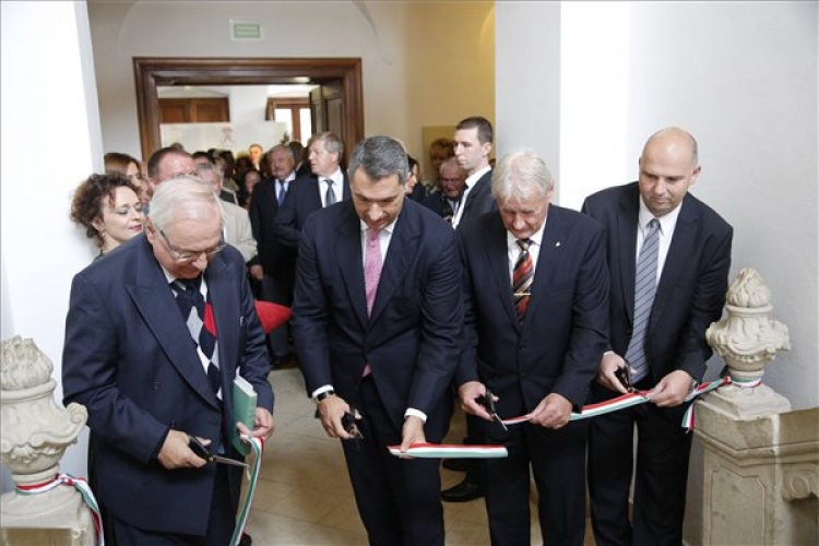 Gergely András történész, Lázár János, a Miniszterelnökséget vezető miniszter, Firtl Mátyás, a KDNP parlamenti képviselője és Bodrogai László Anzelm, az Eszterháza Kulturális, Kutató- és Fesztiválközpont főigazgatója (b-j) átadja a Széchenyi Emlékmúzeum megújult állandó kiállítását Nagycenken Széchenyi István születésének 225. évfordulóján, 2016. szeptember 21-én. (MTI Fotó: Nyikos Péter)