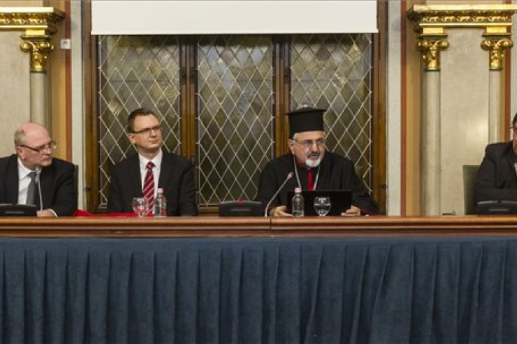 Mar Ignatius Joseph III. Younan, a szír katolikus egyház vezetője, az antióchiai szír katolikus pátriárka (j2) előadást tart Budapesten, a Pázmány Péter Katolikus Egyetem dísztermében 2017. január 11-én. Mellette Rétvári Bence, az Emberi Erőforrások Minisztériuma parlamenti államtitkára, a Kereszténydemokrata Néppárt alelnöke (b2), Török Tamás, az üldözött keresztények megsegítéséért felelős helyettes államtitkár (b) és Fodor György prorektor és dékán (j). (MTI Fotó: Szigetváry Zsolt)