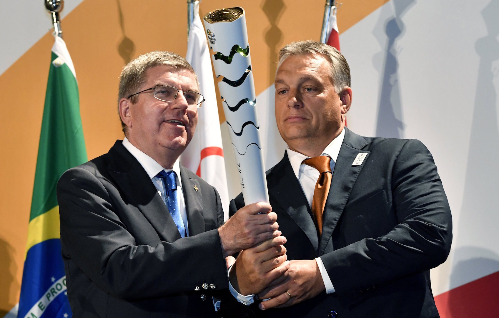 A beszéd végén Thomas Bach a hivatalos riói olimpiai fáklyát ajándékozta Orbán Viktornak.
