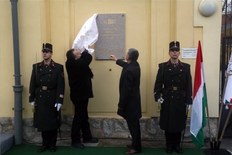 Tarnavölgyi László, a Sárospataki Wass Albert Kör elnöke (b2) és Kövér László, az Országgyűlés elnöke (j2) leleplezi a Gulág helyi áldozatainak tiszteletére állított emléktáblát Sárospatakon 2017. február 24-én. (Fotó: Vajda János – MTI)