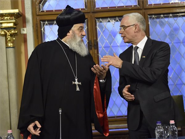 Balog Zoltán, az emberi erőforrások minisztere és II. Efrém Ignác, Antiochia és egész Kelet szír ortodox pátriárkája az előadása előtt a budapesti Pázmány Péter Katolikus Egyetemen 2017. február 22-én. (MTI Fotó: Máthé Zoltán – MTI)