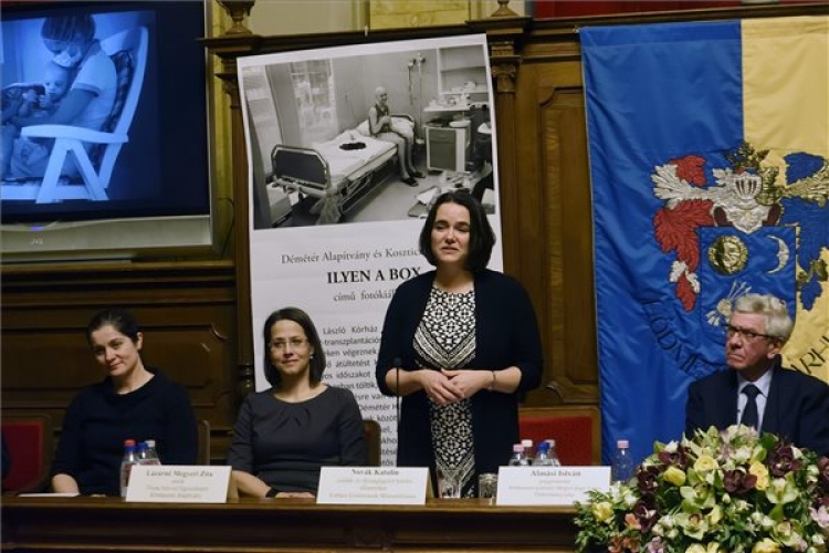 Juhász Tünde Csongrád megyei kormánymegbízott, Lázárné Megyeri Zita, a Tiszta Szívvel Egyesületért Alapítvány elnöke, Novák Katalin, az Emberi Erőforrások Minisztériumának család-, ifjúság- és nemzetközi ügyekért felelős államtitkára és Almási István (Fidesz-KDNP) polgármester (b-j) a Koszticsák Szilárd, az MTI/MTVA fotóriportere képeiből álló, Kell egy ház című országos vándorkiállítás hódmezővásárhelyi megnyitóján 2017. február 24. A fotók az Egyesített Szent István és Szent László Kórház Gyermek-hematológiai és Őssejt-transzplantációs Osztályán és a mellette működő Déméter Házban készültek. (Fotó: Kelemen Zoltán Gergely – MTI)