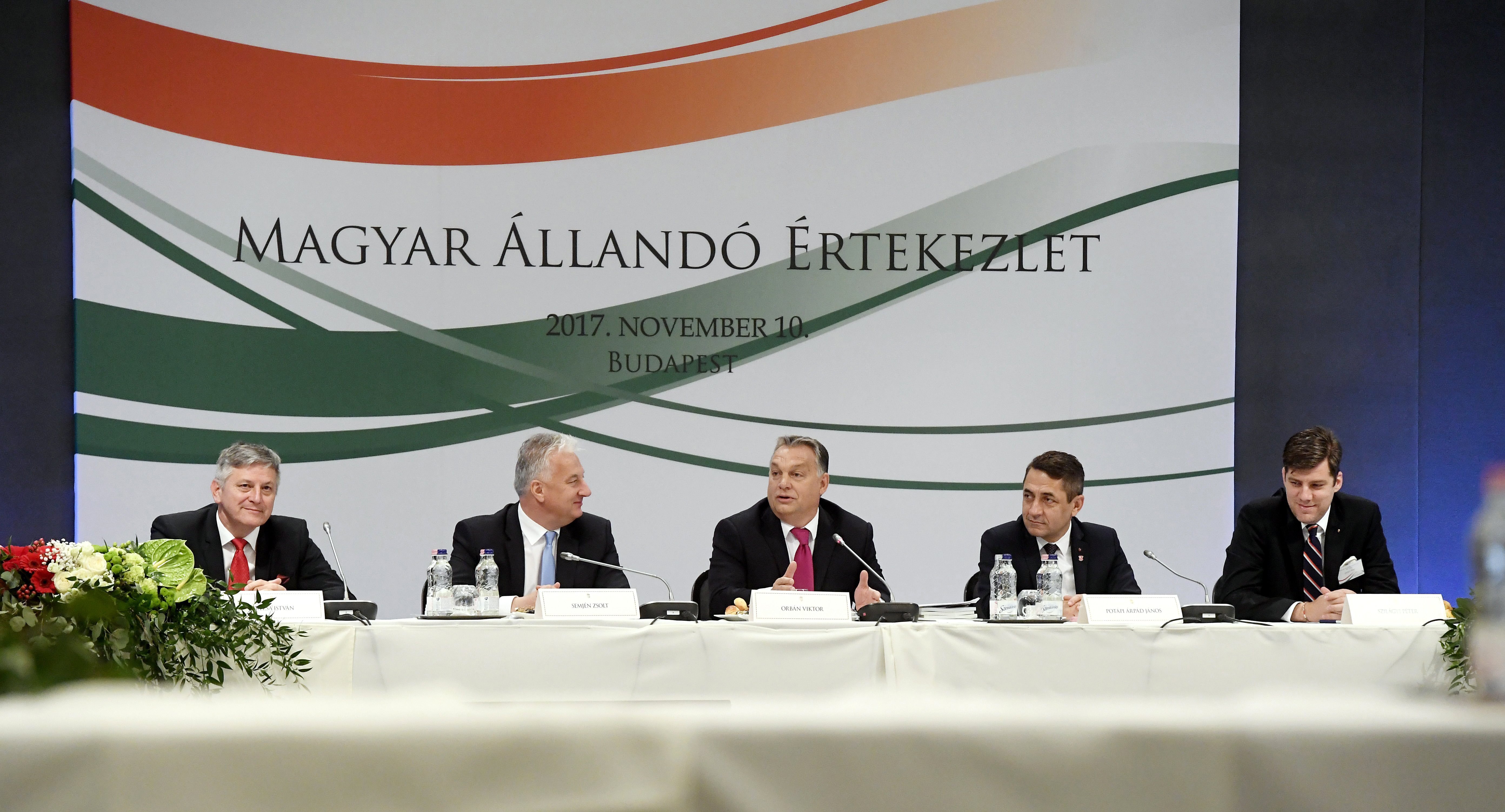 Budapest, 2017. november 10. Orbán Viktor miniszterelnök (k) beszédet mond a Magyar Állandó Értekezlet (Máért) XVI. plenáris ülésén a fővárosi Várkert Bazárban. Mellette Semjén Zsolt nemzetpolitikáért felelős miniszterelnök-helyettes (b2), Grezsa István, Szabolcs-Szatmár-Bereg megye és Kárpátalja együttműködésének és összehangolt fejlesztési feladatainak koordinációjáért felelős kormánybiztos (b), Potápi Árpád János, a Miniszterelnökség nemzetpolitikáért felelős államtitkára (j2) és Szilágyi Péter, a Miniszterelnökség nemzetpolitikáért felelős helyettes államtitkára (j). MTI Fotó: Koszticsák Szilárd