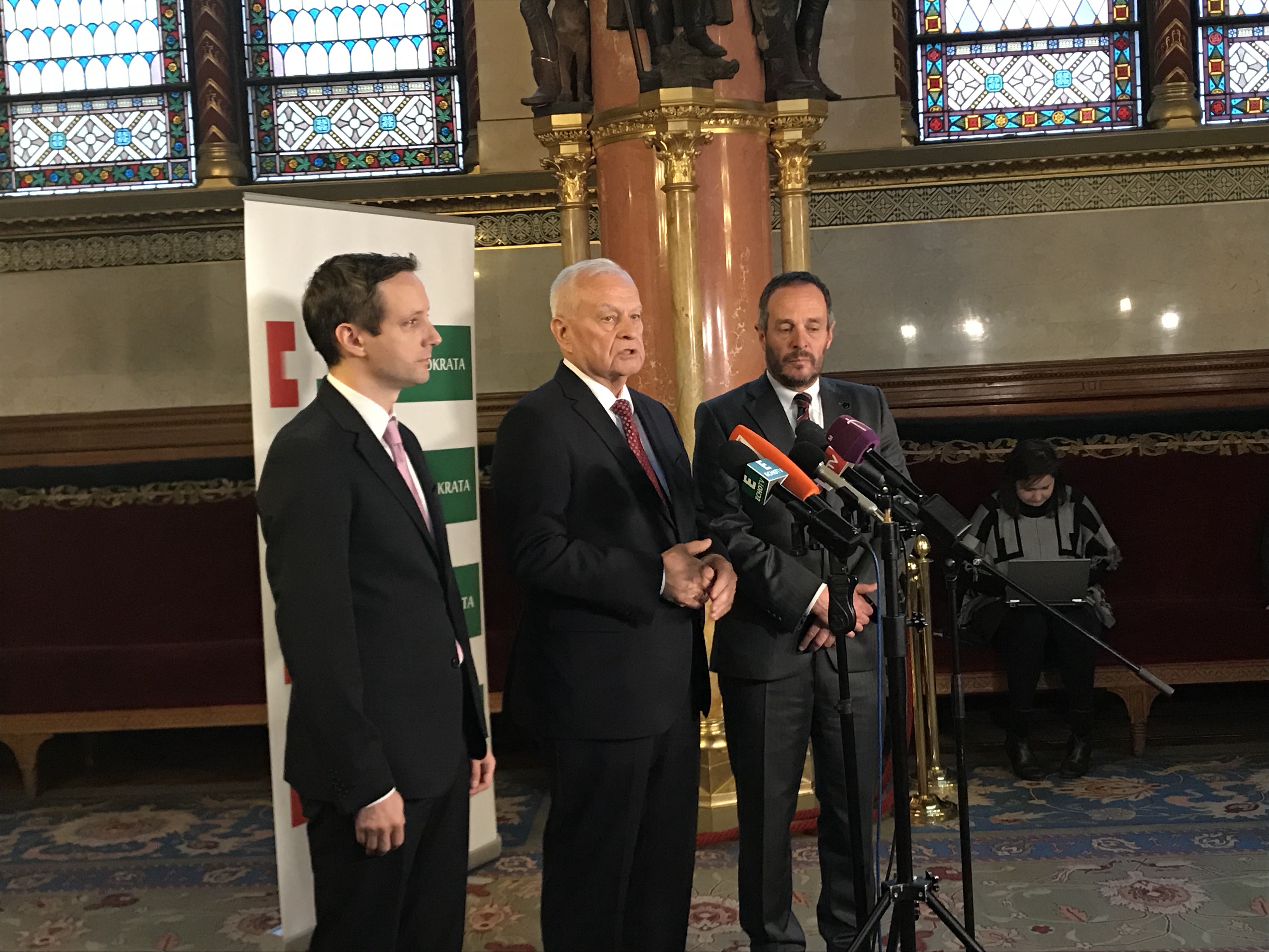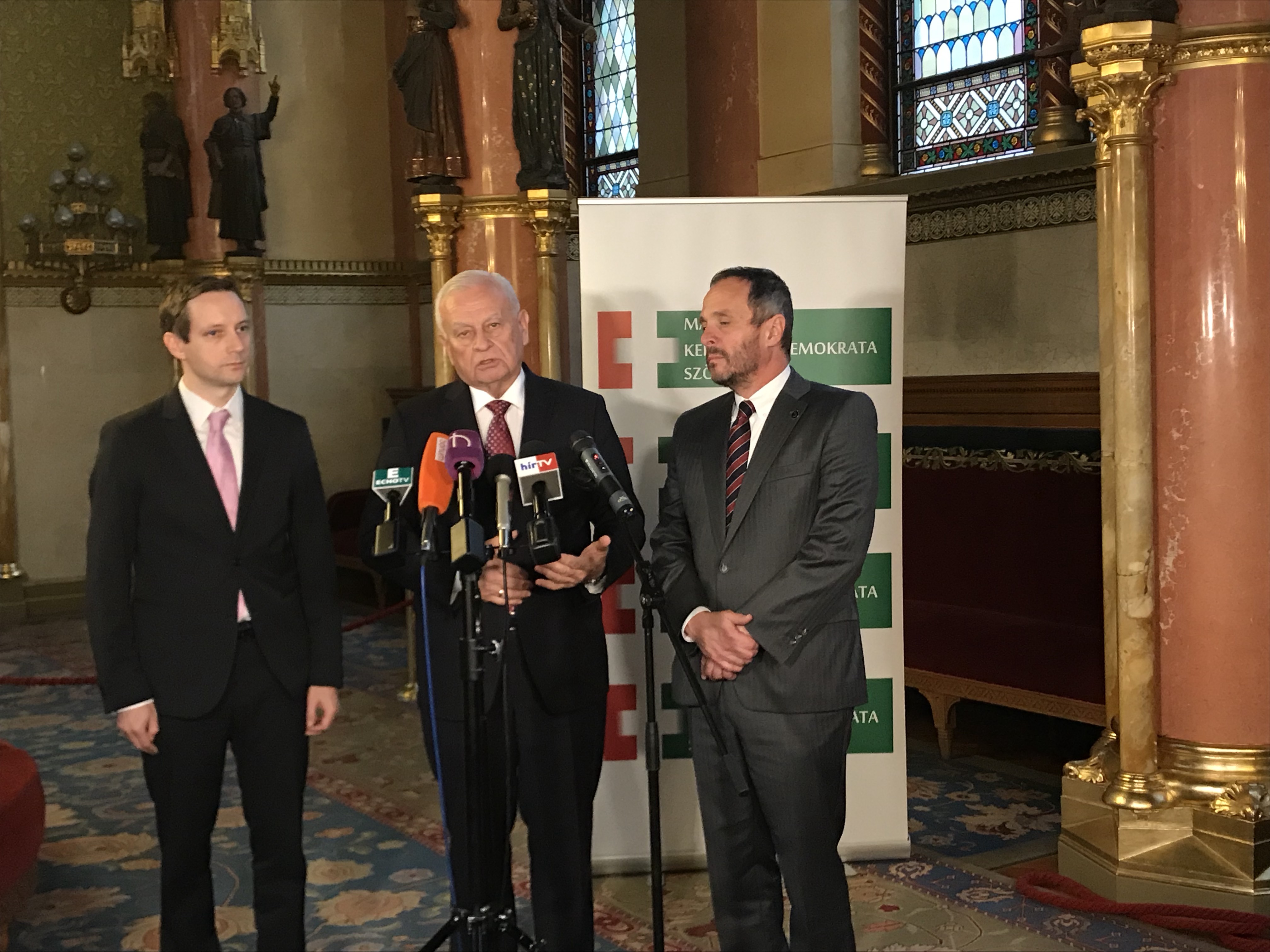 Harrach Péter a Kereszténydemokrata Néppárt frakcióvezetője, a Magyar Kereszténydemokrata Szövetség (MKDSZ) elnöke beszél a keresztényüldözésről tartott konferencia sajtótájékoztatóján pénteken Budapesten, Hölvényi György kereszténydemokrata európai parlamenti képviselővel (j) és Azbej Tristan, az üldözött keresztények megsegítéséért felelős helyettes államtitkárral (b).