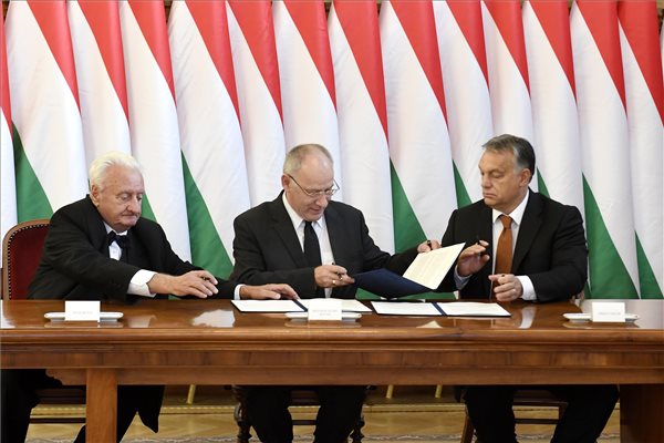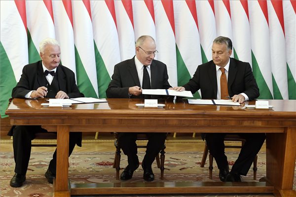 Orbán Viktor miniszterelnök (j), Bogárdi Szabó István püspök, az MRE Zsinatának lelkészi elnöke (k) és Huszár Pál főgondnok, az MRE Zsinatának világi elnöke (b) aláírja a kormány és a Magyarországi Református Egyház (MRE) közötti viszony alapelveiről, az együttműködést meghatározó feladatokról szóló megállapodást az Országházban 2017. október 4-én. A szerződés a korábbi, még 1998-ban kötött megállapodást újította meg. (MTI Fotó: Koszticsák Szilárd)