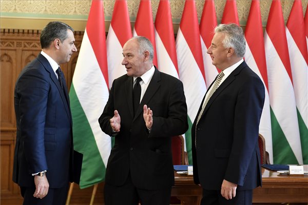 Lázár János, a Miniszterelnökséget vezető miniszter (b) és Semjén Zsolt nemzetpolitikáért felelős miniszterelnök-helyettes (j), valamint Bogárdi Szabó István püspök, az MRE Zsinatának lelkészi elnöke (k), mielőtt a püspök és Orbán Viktor miniszterelnök aláírja a kormány és a Magyarországi Református Egyház (MRE) közötti viszony alapelveiről, az együttműködést meghatározó feladatokról szóló megállapodást az Országházban 2017. október 4-én. (MTI Fotó: Koszticsák Szilárd)