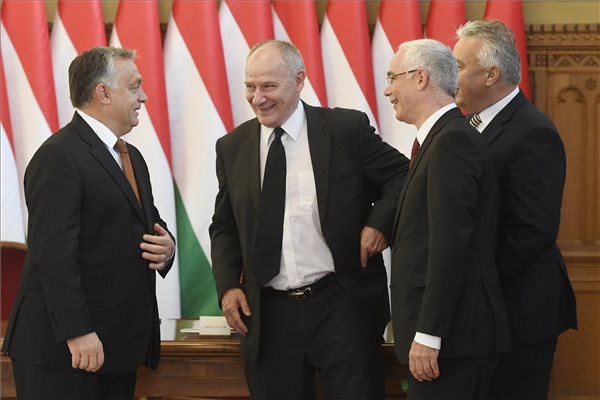 Orbán Viktor miniszterelnök (b) és Bogárdi Szabó István püspök, az MRE Zsinatának lelkészi elnöke (b2) beszélget, miután aláírták a kormány és a Magyarországi Református Egyház (MRE) közötti viszony alapelveiről, az együttműködést meghatározó feladatokról szóló megállapodást az Országházban 2017. október 4-én. A szerződés a korábbi, még 1998-ban kötött megállapodást újította meg. Mellettük Balog Zoltán, az emberi erőforrások minisztere (j2) és Semjén Zsolt nemzetpolitikáért felelős miniszterelnök-helyettes (j). (MTI Fotó: Koszticsák Szilárd)