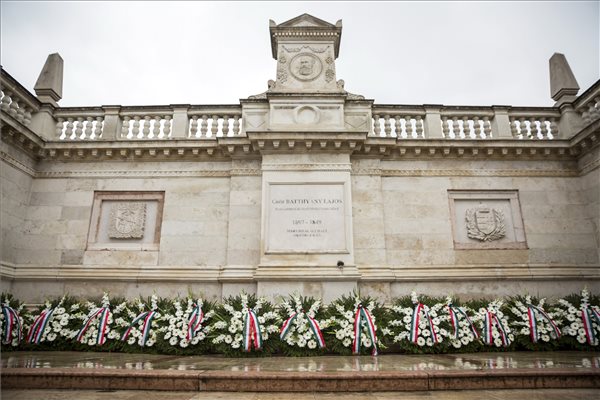 Koszorúk Batthyány Lajos és családja nyughelyénél a Fiumei úti Nemzeti Sírkertben, a Batthyány-mauzóleumnál tartott megemlékezésen az aradi vértanúk emléknapján. (MTI Fotó: Mohai Balázs)