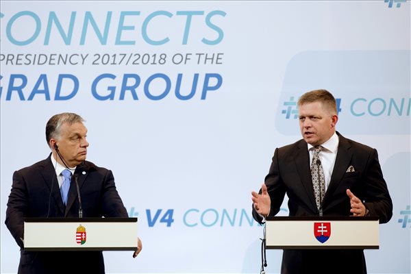 Orbán Viktor magyar (b) és Robert Fico szlovák miniszterelnök a visegrádi országok (V4) miniszterelnökeinek találkozóján tartott sajtótájékoztatón a Pesti Vigadóban 2017. július 4-én. (MTI Fotó: Koszticsák Szilárd)