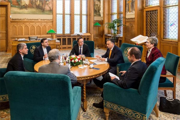 Orbán Viktor miniszterelnök hivtalában megbeszélést folytat Ali Tajebnia iráni gazdasági és pénzügyminiszterrel (b) 2017. február 7-én. A kormányfő mellett Szijjártó Péter külgazdasági és külügyminiszter. (MTI Fotó: Miniszterelnöki Sajtóiroda / Botár Gergely)