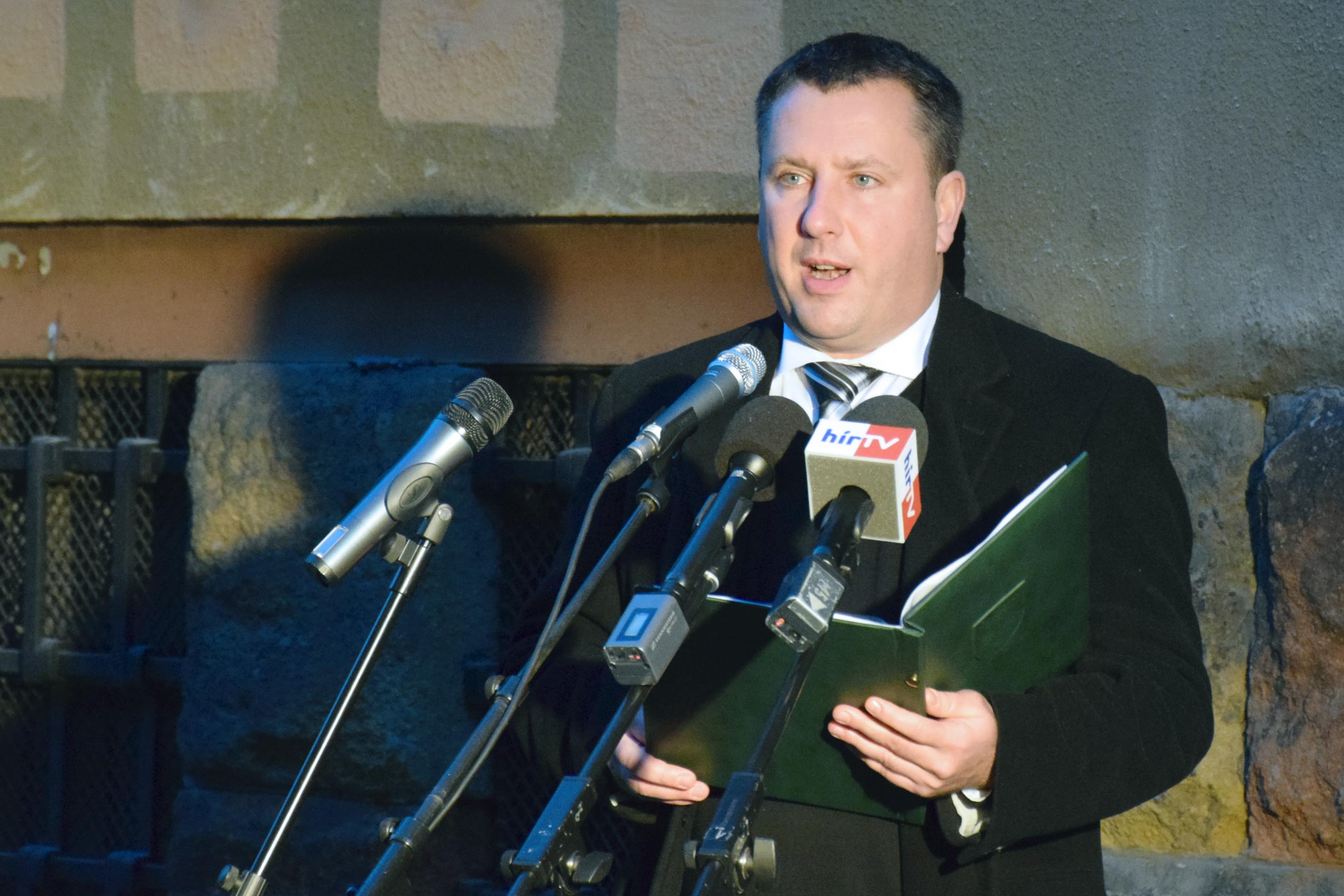 Láng Zsolt, a II. kerület polgármestere a KDNP fővárosi és II. kerületi szervezetének a kommunizmus áldozatai emléknapja alkalmából tartott megemlékezésén a Gyorskocsi utcai emléktáblánál 2017. február 23-án. (KDNP Fotó: Váli Miklós)