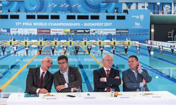 Balog Zoltán, az emberi erőforrások minisztere, Seszták Miklós nemzeti fejlesztési miniszter, a szervezőbizottság elnöke, Tarlós István főpolgármester és Fürjes Balázs kiemelt budapesti beruházásokért felelős kormánybiztos (b-j) a 17. vizes világbajnokságot értékelő sajtótájékoztatón a Duna Arénában 2017. július 31-én. (MTI Fotó: Szigetváry Zsolt)