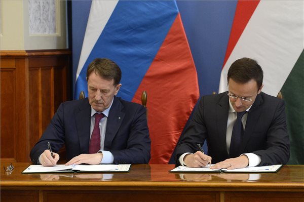 Szijjártó Péter külgazdasági és külügyminiszter (j) és Alekszej Gorgyejev, Voronyezs megye kormányzója együttműködési megállapodást ír alá a Külgazdasági és Külügyminisztériumban (KKM) 2017. október 25-én. (MTI Fotó: Soós Lajos)