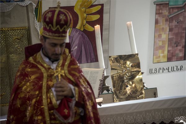 Krikor Badichah, a római XIII. Leó Örmény Kollégium rektorhelyettese örmény rítusú szentmisét mutat be a budapesti Örmény Katolikus Lelkészség épületében 2017. január 8-án. Jobbra a szíriai Keszab városából származó, az Iszlám Állam által megsemmisített örmény katolikus templom szentségházának lőfegyverrel megrongált fedőlemeze (tabernákulum). (MTI Fotó: Marjai János)