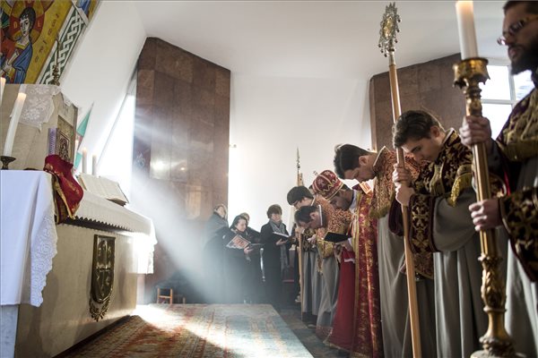 Krikor Badichah, a római XIII. Leó Örmény Kollégium rektorhelyettese (j4) örmény rítusú szentmisét mutat be a budapesti Örmény Katolikus Lelkészség épületében abból az alkalomból, hogy átadták a magyar kormány képviselőinek a szíriai Keszab városából származó, az Iszlám Állam által megsemmisített örmény katolikus templom szentségházának lőfegyverrel megrongált fedőlemeze (tabernákulum) 2017. január 8-án. (MTI Fotó: Marjai János)