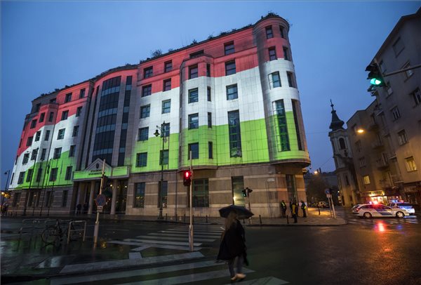 Fényfestés a Külgazdasági és Külügyminisztérium épületén az 1956-os forradalom és szabadságharc 61. évfordulója alkalmából a Bem téren 2017. október 22-én. (MTI Fotó: Mohai Balázs)