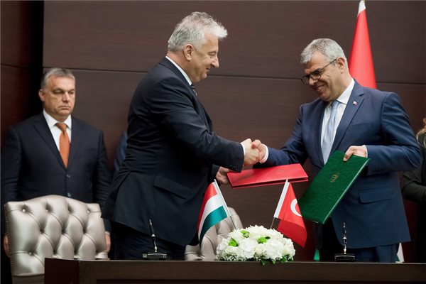 Semjén Zsolt nemzetpolitikáért felelős miniszterelnök-helyettes, a KDNP elnöke és Veysi Kaynak török miniszterelnök-helyettes kezet fog az együttműködési szándéknyilatkozat aláírása után Ankarában a magyar-török kormányzati konzultáció után 2017. június 30-án. Balra Orbán Viktor miniszterelnök. (MTI Fotó: Koszticsák Szilárd)