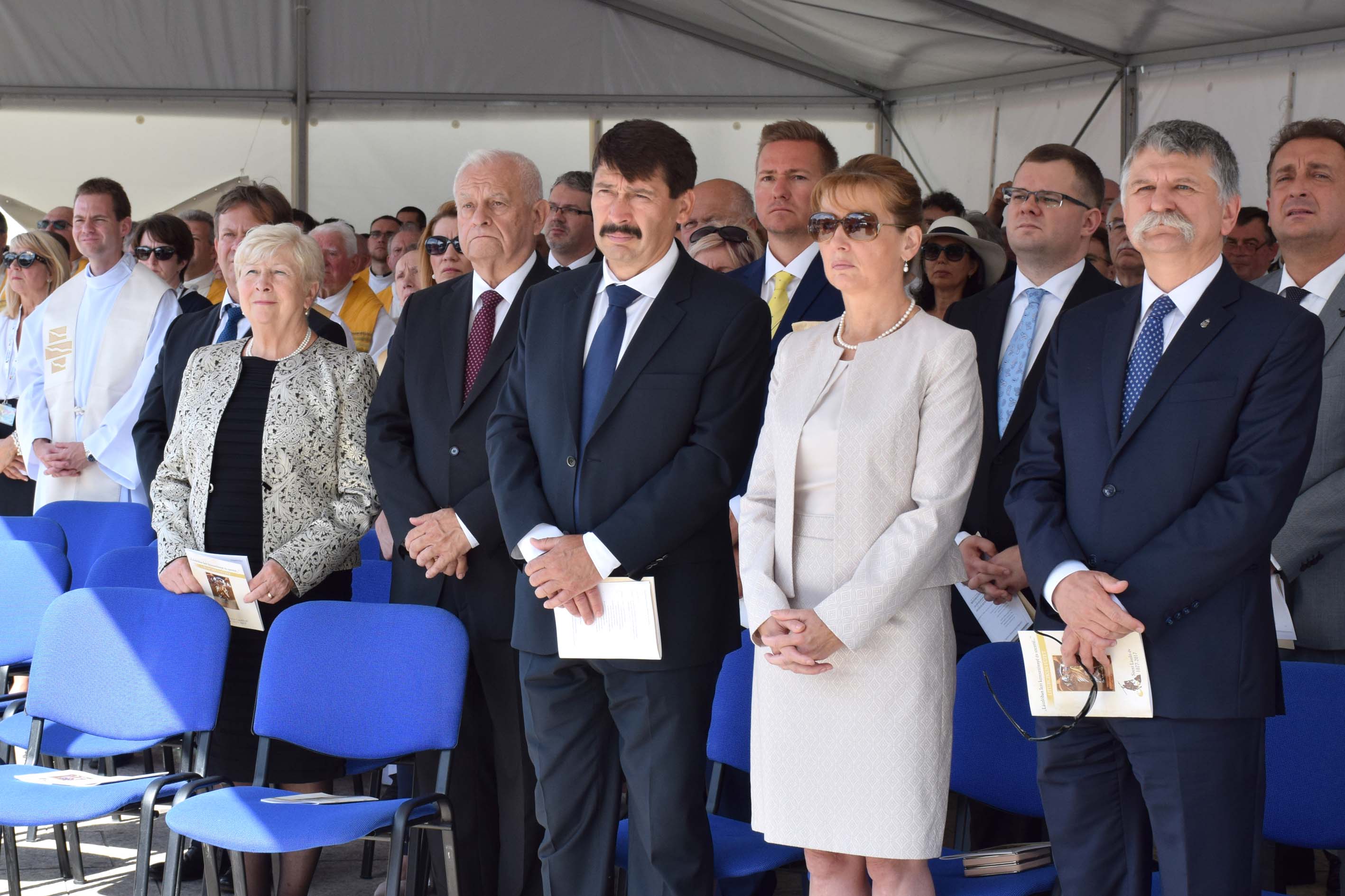 Áder János köztársasági elnök és felesége, Herczegh Anita, Kövér László, az Országgyűlés elnöke, Borkai Zsolt polgármester (az első sorban, b-j), valamint Harrach Péter, a Kereszténydemokrata Néppárt frakcióvezetője és felesége, Csilla asszony (b) a Szent László-napok alkalmából tartott szabadtéri szentmisén, a győri Dunakapu téren 2017. június 27-én. (MTI Fotó: Bodnár Boglárka)