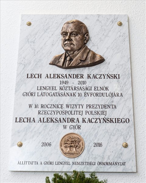 A győri lengyel nemzetiségi önkormányzat által szervezett esemény végén a Győri Nemzeti Színház aulájában emléktáblát avattak, Lebó Ferenc győri szobrászművész fehér márványból készült alkotását. A táblán felül Lech Kaczynski domborképe, alsó részén a lengyel-magyar barátság jelképe, az összefonódó két tölgyfa látható. Alatta magyarul és lengyelül is az olvasható, hogy „Lech Kaczynski lengyel köztársasági elnök győri látogatásának tizedik évfordulójára".